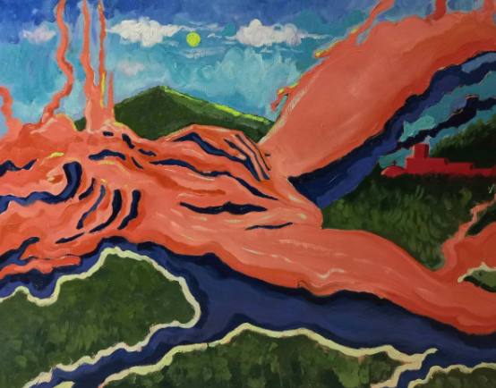 At the center of Podgorica’s practice lies the human figure—fragmented, transformed, and situated within symbolic environments that oscillate between reality and imagination. Her compositions unfold as open-ended visual fields where bodies, organic forms, and familiar elements coexist in dreamlike constellations.